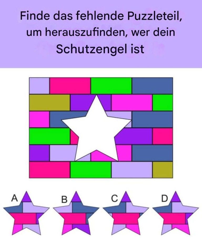 Dieses visuelle Puzzle lädt Sie ein, herauszufinden, welcher Schutzengel am besten zu Ihrer Persönlichkeit und Ihrem Lebensweg passt. Das Design zeigt ein farbenfrohes Mosaik mit einer fehlenden Sternform in der Mitte. Darunter sind vier mögliche sternförmige Teile abgebildet. Die Aufgabe ist einfach: Wählen Sie das Sternteil, das sich für Sie richtig anfühlt. Ihre Entscheidung – selbst wenn sie schnell oder intuitiv getroffen wird – kann Ihnen etwas über die Eigenschaften verraten, die Sie suchen, oder über die Führung, die Sie anspricht.